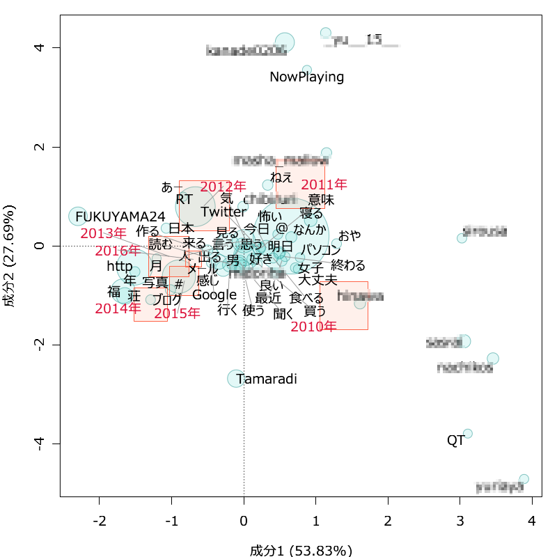 反対に若干見づらいが真ん中の方にある「思う」とか「好き」とかはまんべんなくどの年にもつぶやかれている言葉ということになる。