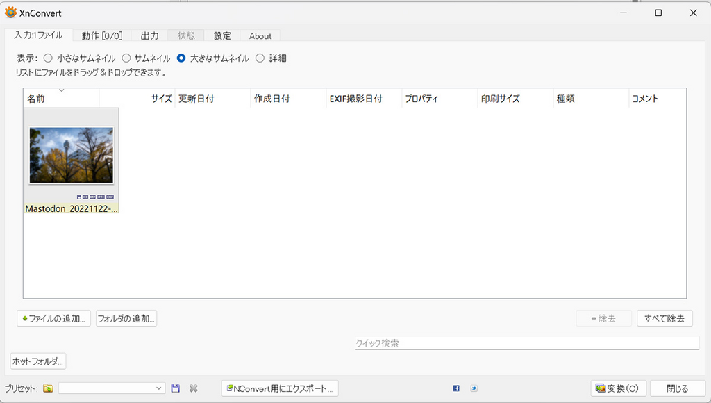 なんらか他の方法はないかと調べてみたところ、「XnConvert」というフリーソフトを利用することで同様の作業を行うことができることがわかったので、ここに書き記しておきましょう。