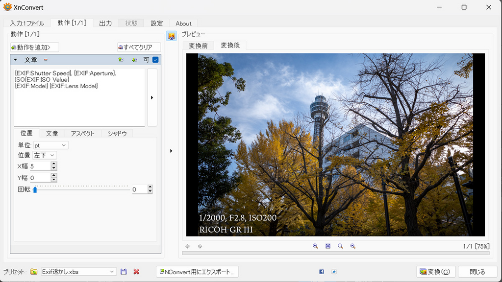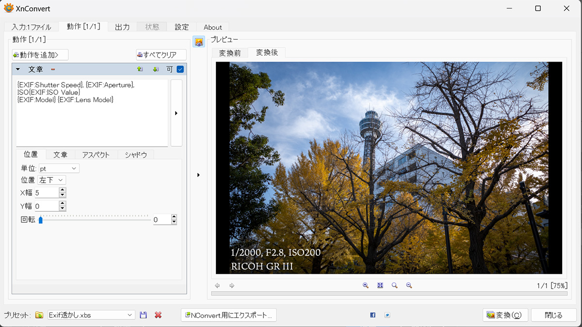 Exif情報を透かしとして載せる方法…XnConvert編