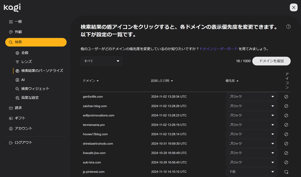 検索結果に登場するページを、ドメイン別に評価できる機能。Kagiのかなり重要な機能といえる。