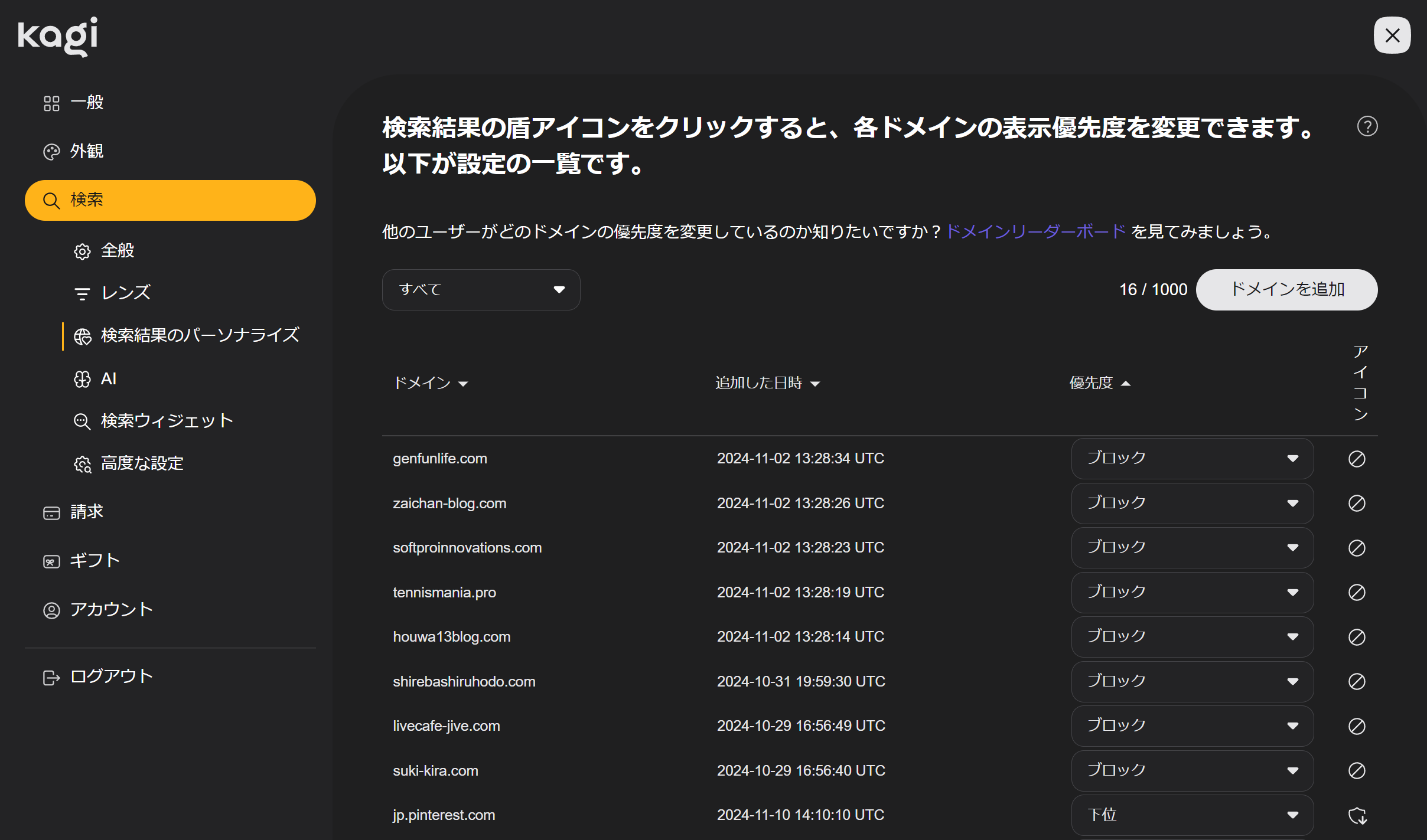検索結果に登場するページを、ドメイン別に評価できる機能。Kagiのかなり重要な機能といえる。